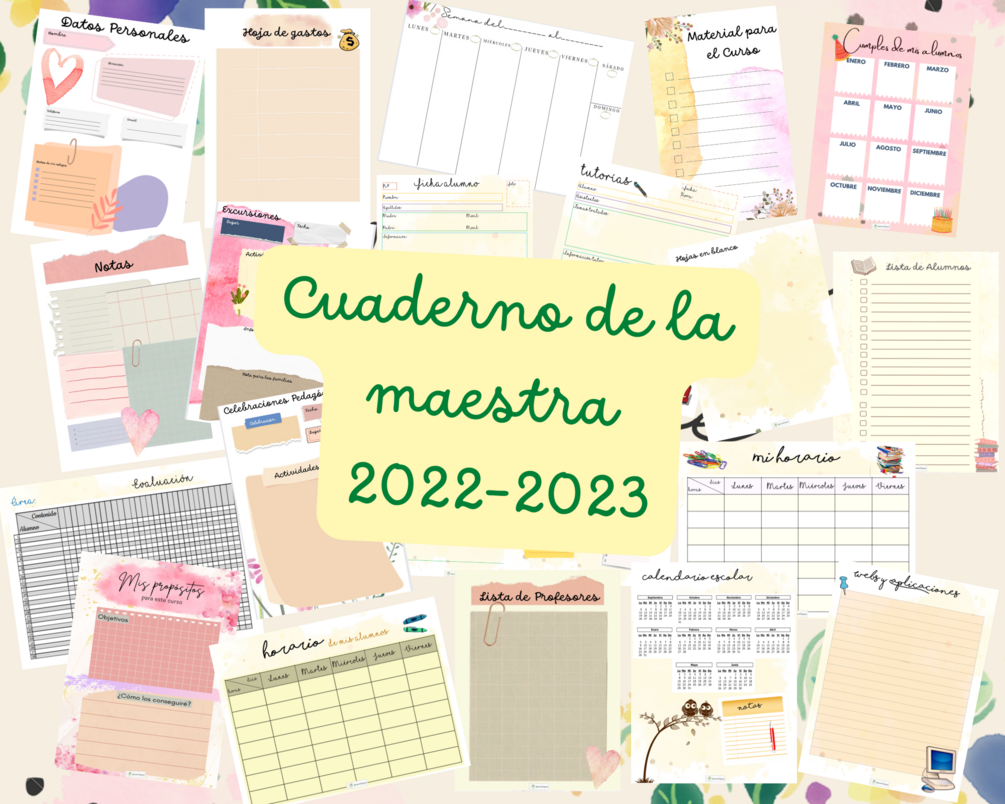 CUADERNO-AGENDA-PLANIFICADOR DE LA MAESTRA/PROFE/SEÑO para el curso 2022-2023 ¿Qué incluye? Pues todo o prácticamente todo lo que solemos utilizar en el día a día de las clases. Con un montón de apartados y de ideas.